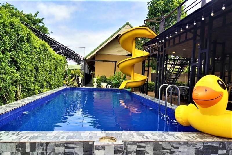 1.ห้องพักรายวัน มี 9 ห้องนอน พร้อมสระว่ายน้ำ ห้องคาราโอเกะ โต๊ะสนุ้ก